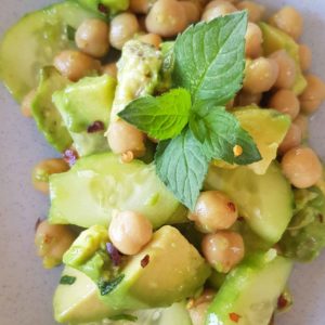 Odcedzoną ciecierzycę i pokrojonego w grubsze półplasterki ogórka wymieszaj dobrze z trzema łyżkami oliwy, trzema łyżkami wody i trzema łyżkami soku z cytryny. Dodaj otartą ze sparzonej cytryny skórkę oraz posiekane kilka listków mięty. Wsyp trochę soli i płatki chili. Zmieszaj i odstaw do lodówki na ok. 30 minut. Następnie dodaj pokrojony w dużą kostkę miąższ z awokado. Wszystko ostrożnie wymieszaj i dopraw solą. Podawaj z listkiem mięty.